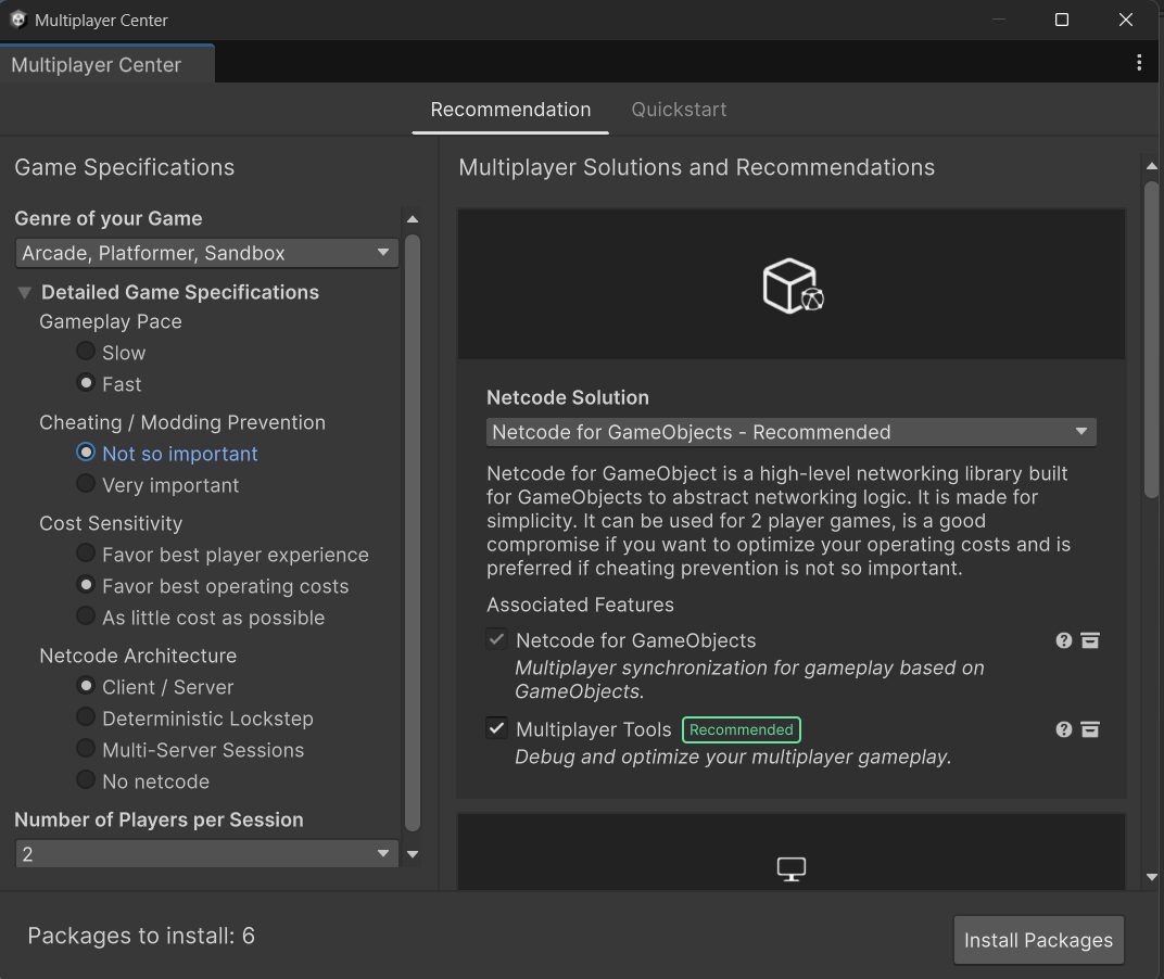 Recommandation에서 위에 간략하게 설명한 모든 옵션 선택을 마치면, 오른쪽에 추천하는 패키지들이 나타난다. 나의 선택에 따라 추천 패키지나 Netcode Solution 등이 바뀌지만, 임의로 선택을 해제하거나 옵션을 바꿀 수도 있다. 또한 최하단에 Dedicated Server Package 역시 있었지만, 내가 선택한 옵션에서는 incompatible이라는 문구와 함께 아예 선택할 수 없게 되어 있었다. 아마 추가적인 패키지 설치를 해야만 사용할 수 있는 기능으로 보인다.