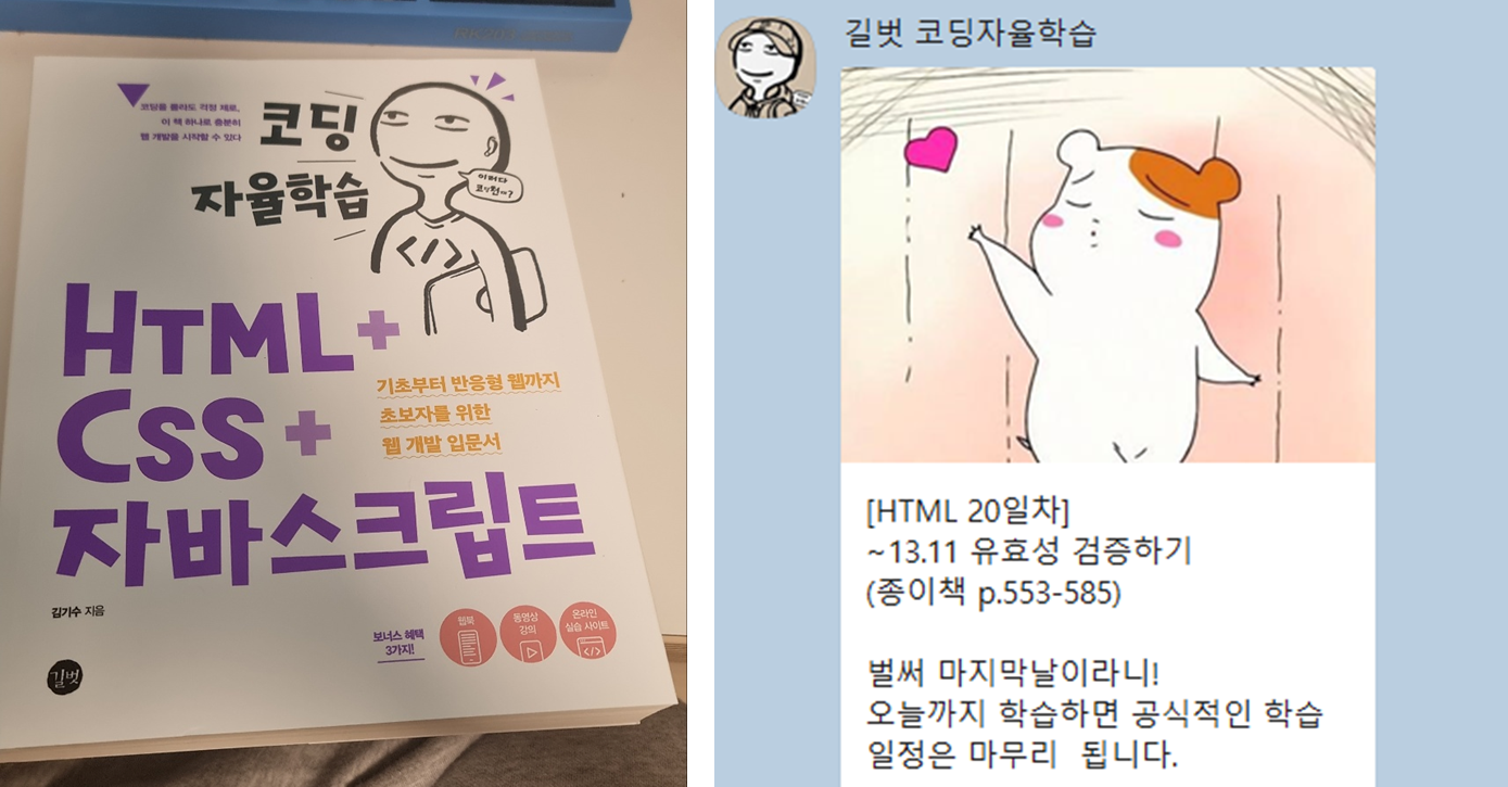 왼쪽은 내가 책을 처음 구매했을 때 찍은 사진이고, 오른쪽은 길벗에서 매일매일 보내주는 오늘의 학습 내용과 동기부여 글귀를 담은 카카오톡 알림이다. 커리큘럼을 적정 범위로 설정해주고, 평일 오전 10시마다 알림을 주어서 그나마 밀리지 않고 한달만에 책을 완독에 가깝게 끝낼 수 있었다.