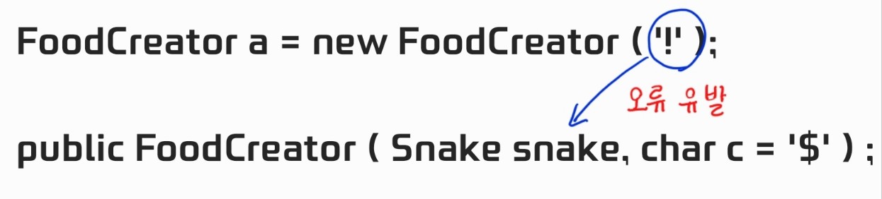 여기서 마지막에 char c = '$' 가 생소할 수 있다. 이건 기본(default) 매개변수이다. 아까 <3>의 선언부에서는 분명 char의 입력이 없었다. 그런 경우에, c에는 임의로 '$' 값이 들어가게 된다. 하지만 만약 new FoodCreator(snake, '!')로 인스턴스를 생성한다면, 이제 c값에는 default값인 '$' 대신 '!'이 들어가게 되는 것이다.
